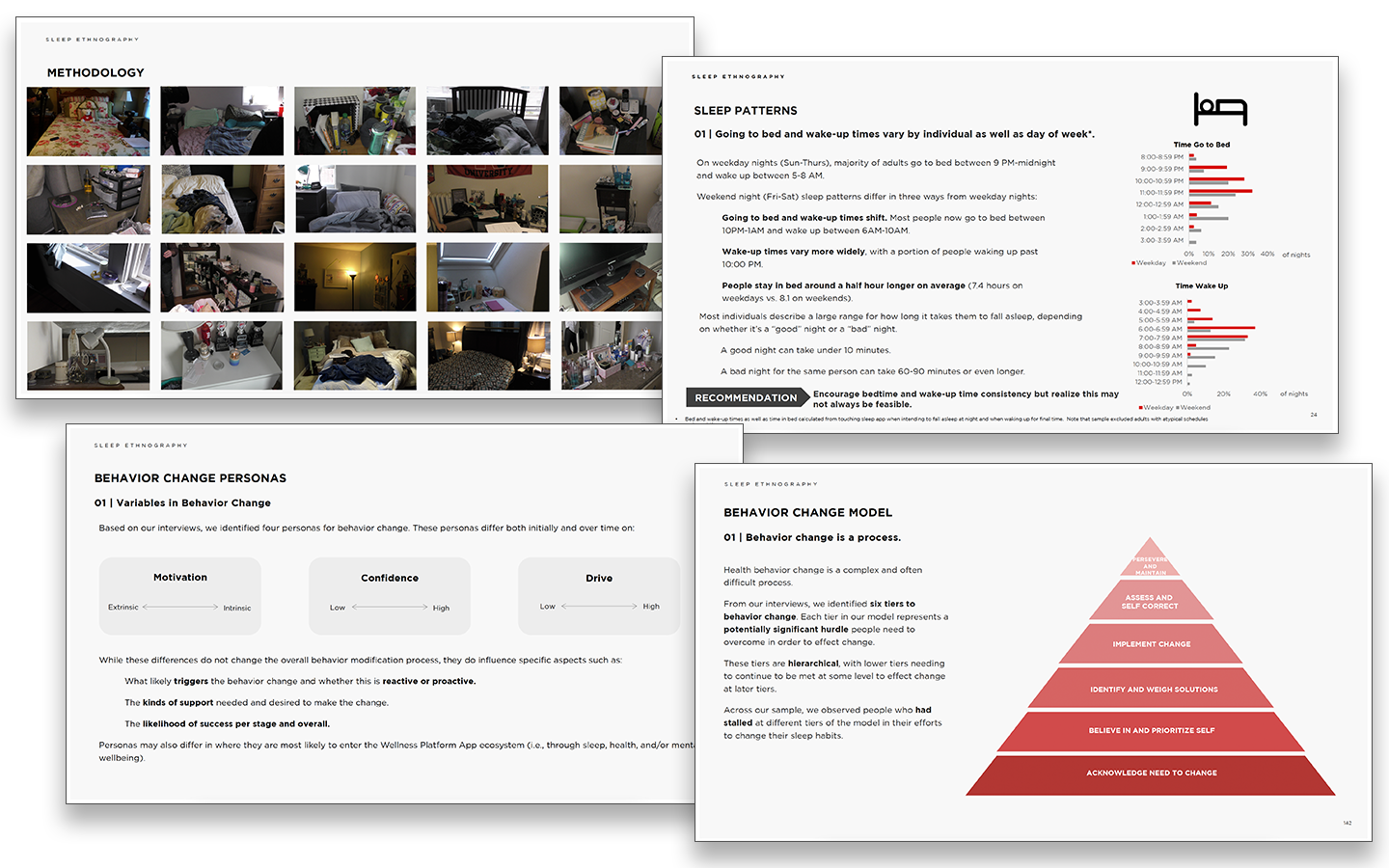 Company X, in the consumer electronics space, has mainly focused on hardware design and manufacturing for the past several decades. The company was starting to explore connected devices and the role of software to supplement their product experience. They had two asks: to coach their teams on processes for designing and building digital experiences and actively work on a new connected product to monitor sleep and encourage behavior change.