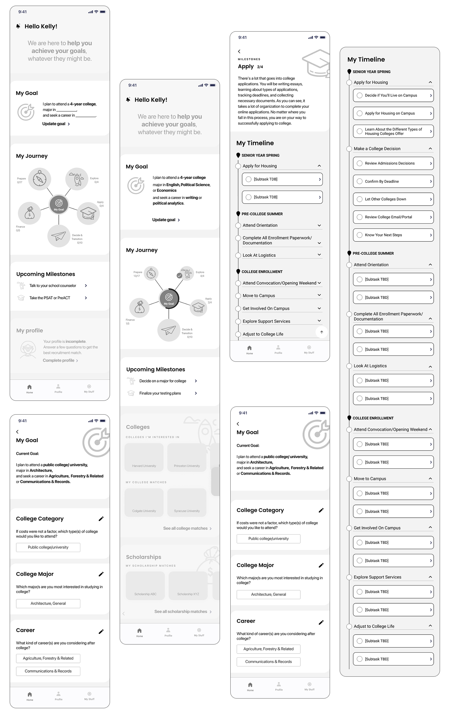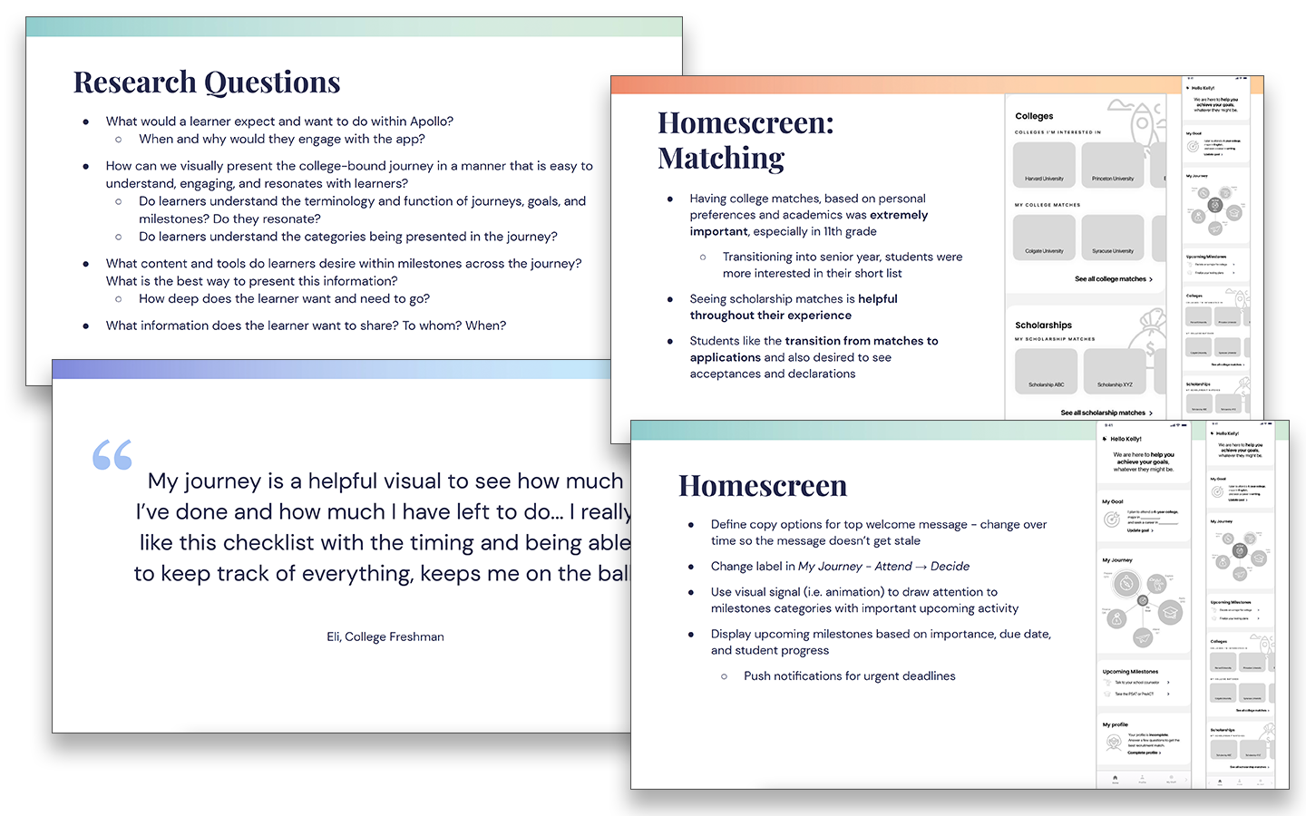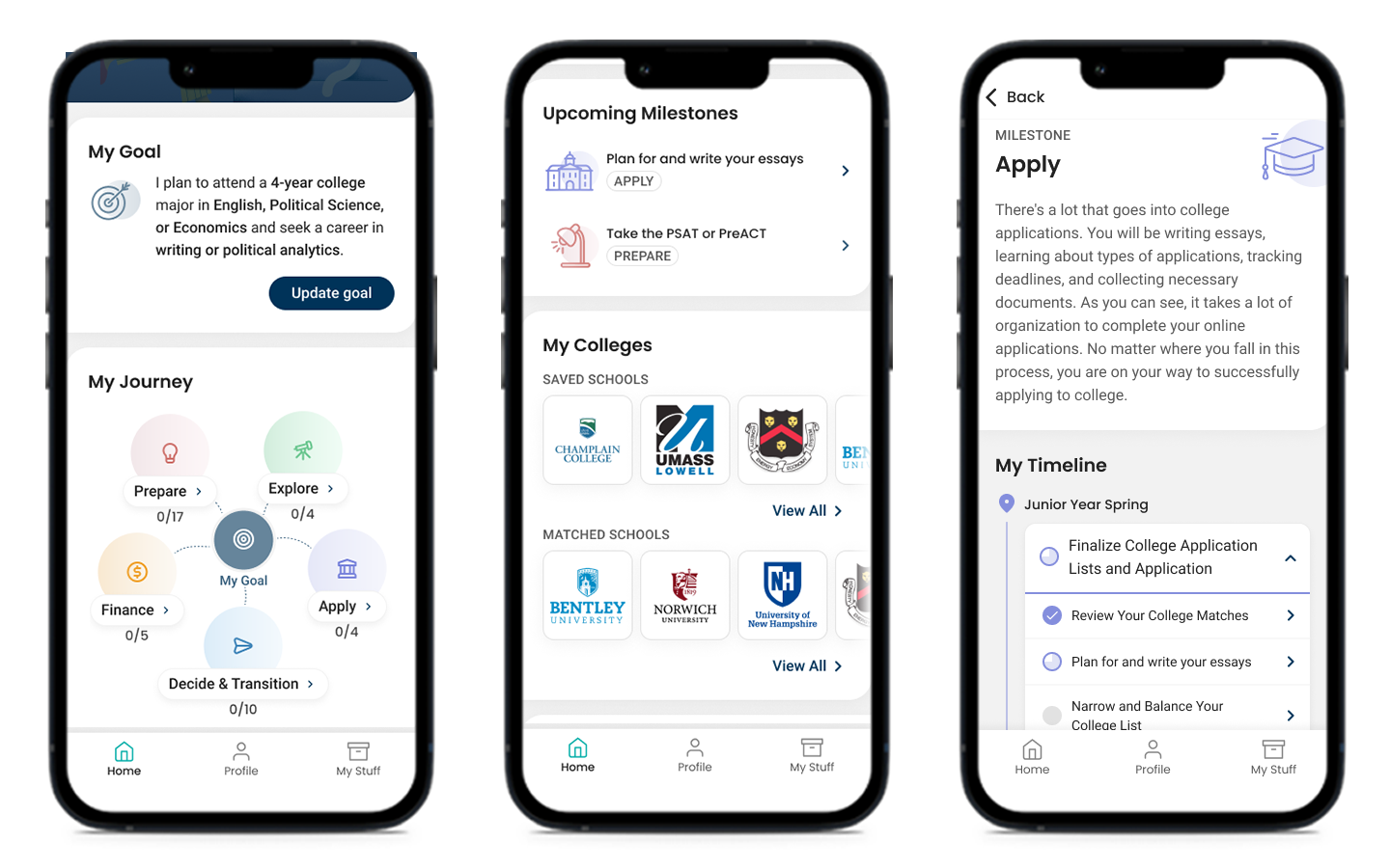 Encoura is a research, data science, and advisory firm that connects students and higher education institutions. Their goal was to build an app that helps high school students plan, make informed decisions, and prepare for the next steps in their education and/or career path. The app would leverage some of their existing tools (college and scholarship matching) and provide a more holistic, guided, personalized experience for students and parents.